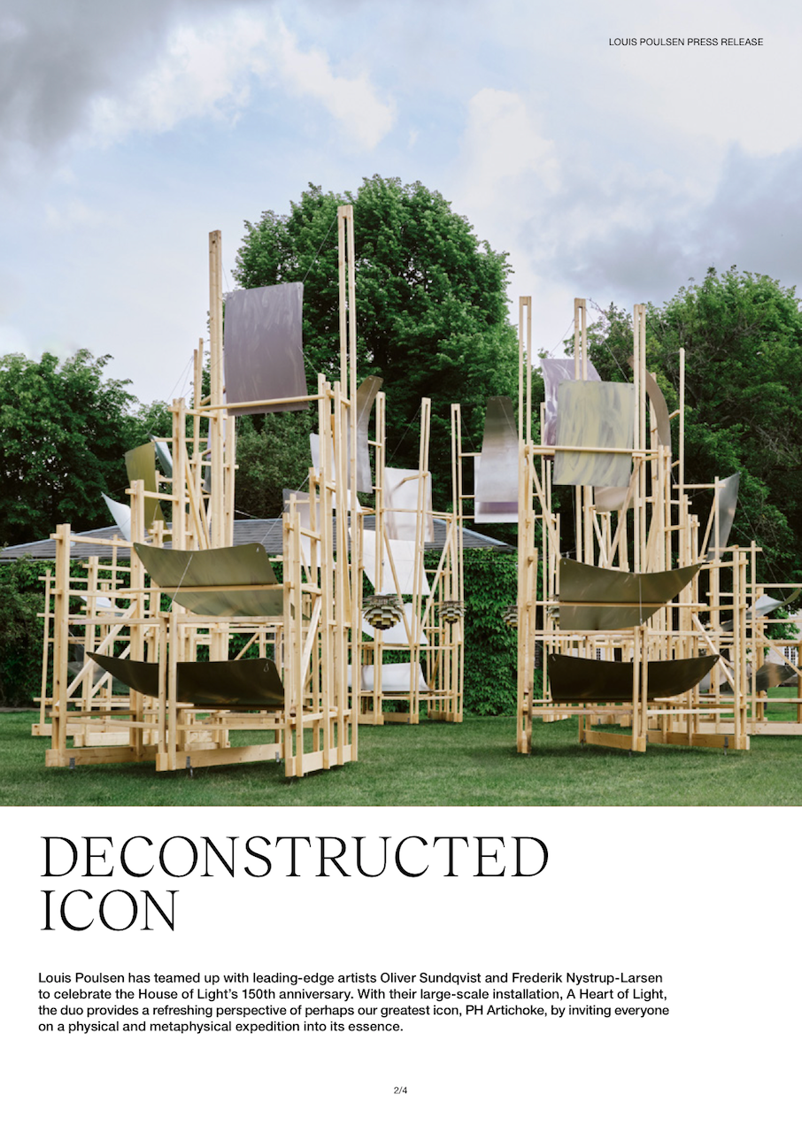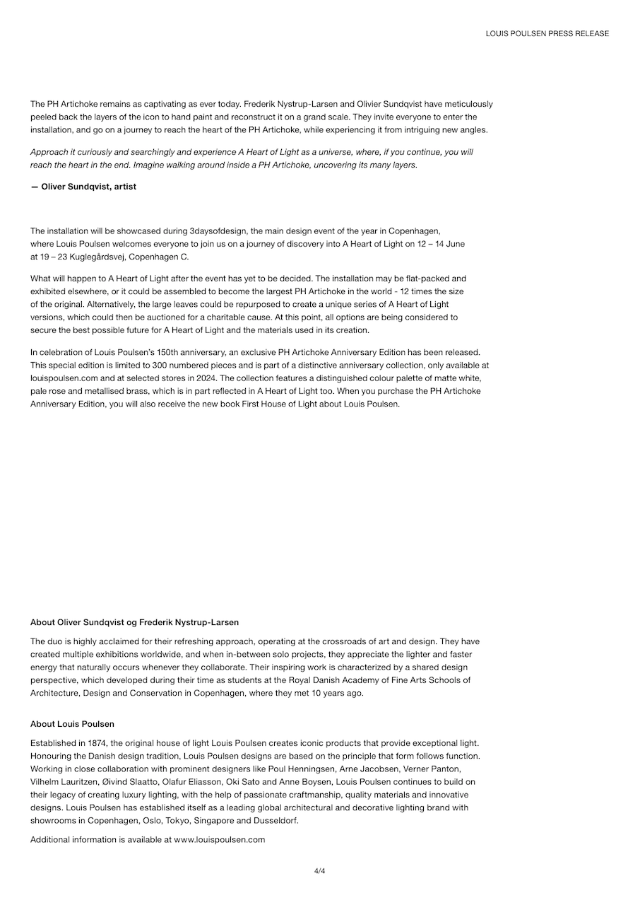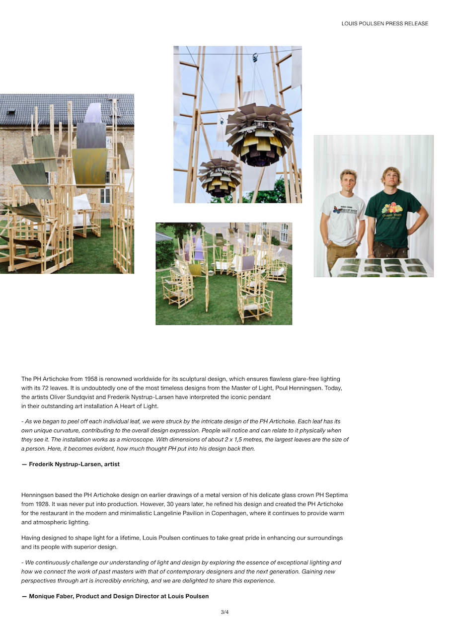 Louis Poulsen fejrede 150 års jubilæum i samarbejde med kunstnerne Oliver Sundqvist og Frederik Nystrup-Larsen under 3daysofdesign i 2024. A Heart of Light er deres fortolkning af PH Artichoke, Poul Henningsens måske største ikon.